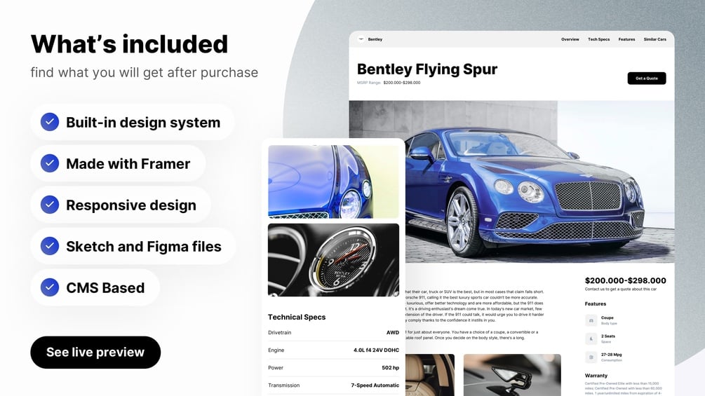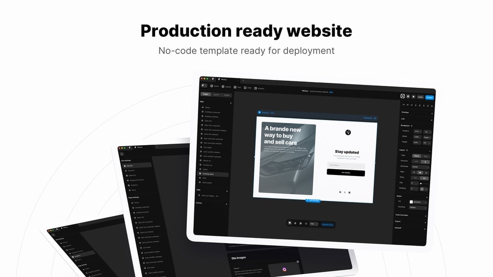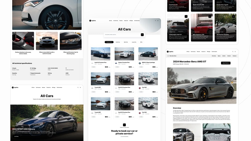 ByDrive is a perfect Framer no-code template for car rental and dealership websites. Build a website for luxury, sports, or regular rental car searches. Car listings are connected with the Framer CMS allowing you to manage content easily without a single line of code.