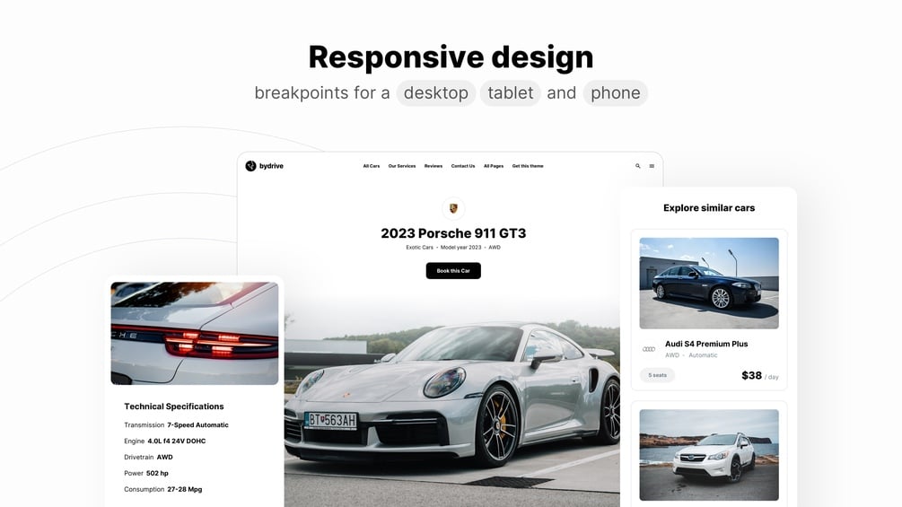 ByDrive is a perfect Framer no-code template for car rental and dealership websites. Build a website for luxury, sports, or regular rental car searches. Car listings are connected with the Framer CMS allowing you to manage content easily without a single line of code.