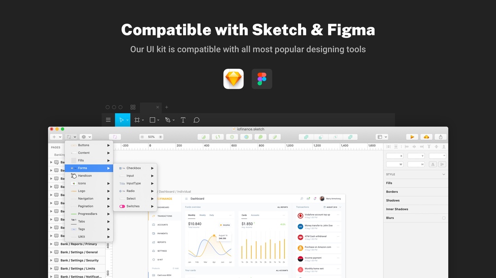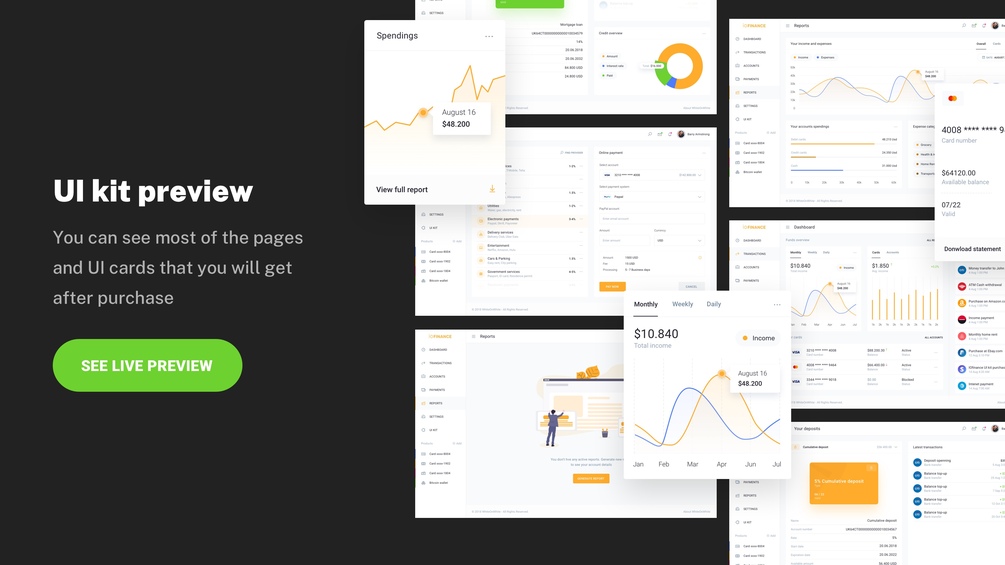 Using IOFinance UI kit you can design these Fintech SaaS websites: Corporate banking products, Individual banking portals, Trading platforms, and Personal wallets, each of these sections has its own unique elements and widgets.