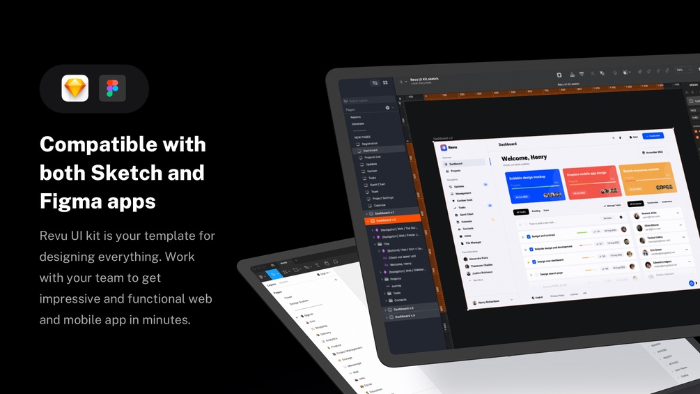 Design a project management app, calendar planner, dashboard, to-do app, kanban desk, database, CRM portal, and many more SaaS tools with Revu UI template.