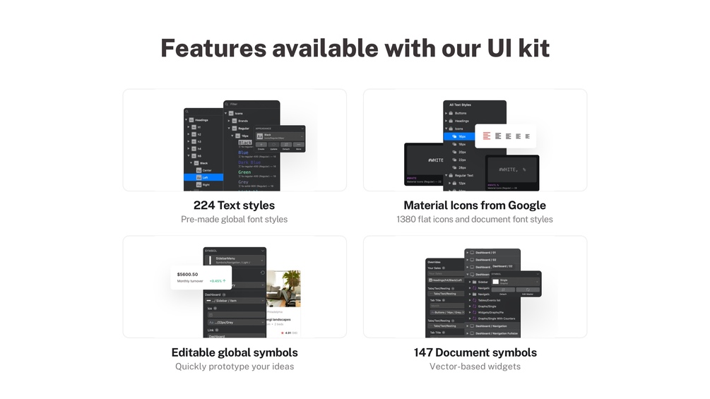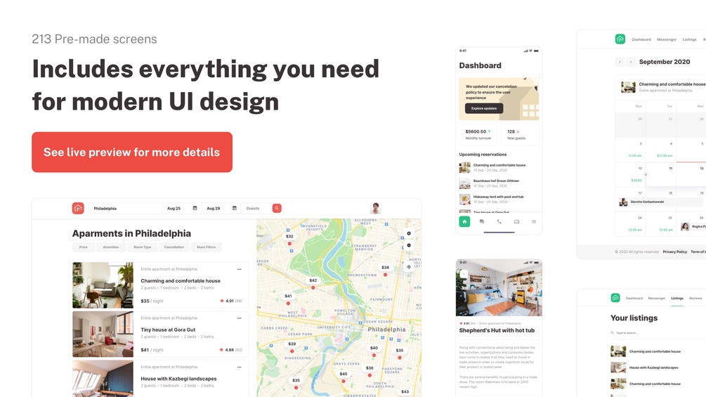 We designed 213 beautiful web pages and mobile app screens. You can use our set of 147 unique UI kit components to build any real estate booking mobile app or website. All symbols and objects are vector-based and easily editable.