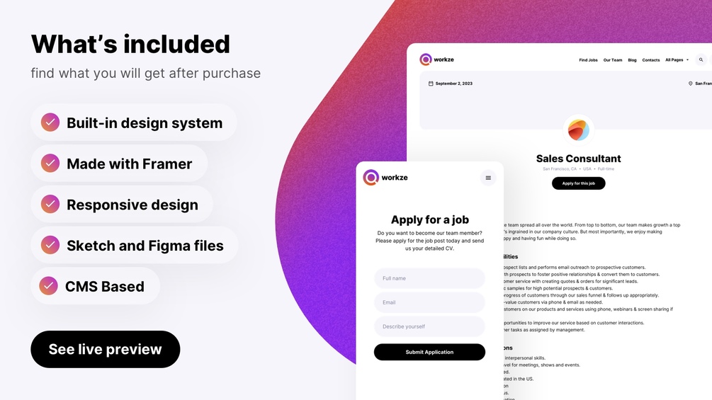 Check out 19 pre-made responsive pages ready for desktop, tablet and phone. Our template was made with Framer and all graphics resources are available in Sketch and Figma apps.